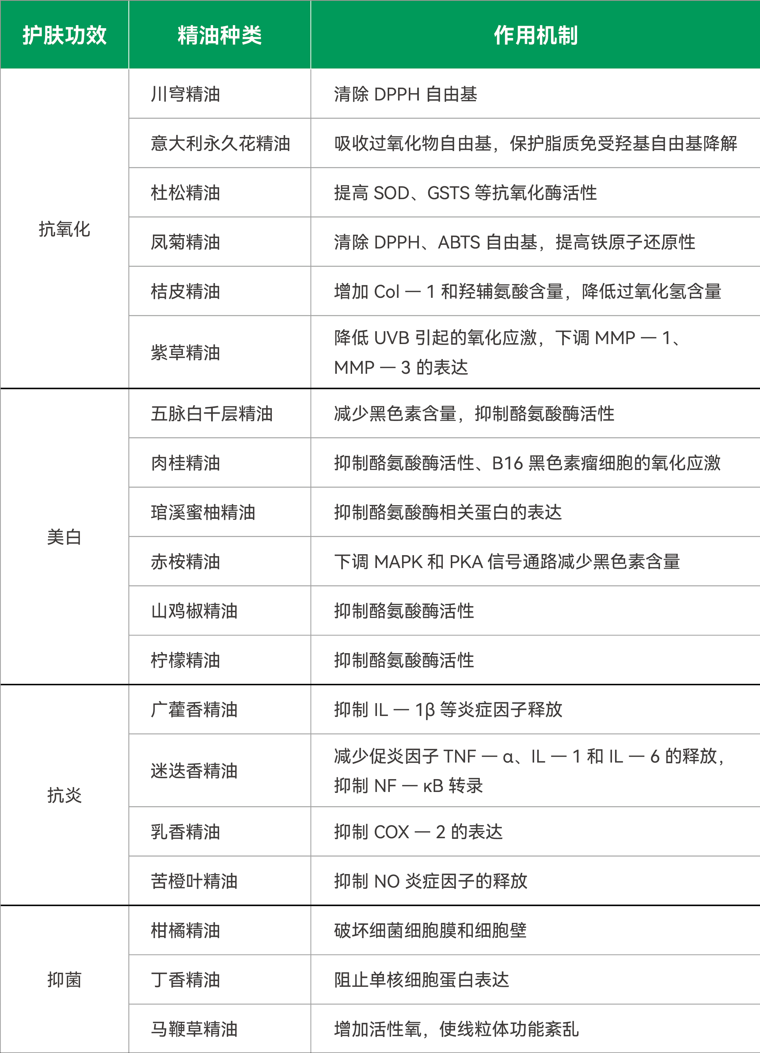 植物精油具有分子結構小且滲透性強的特點,已發現具有延緩衰老、美白、殺菌消炎等多種護膚功效,近些年開發成天然護膚品受到人們關注,并逐步被應用在常見護膚體系中。國內外專家學者對大量植物精油的生理活性和作用機理進行研究分析和數據采集。相關研究成果如下表: