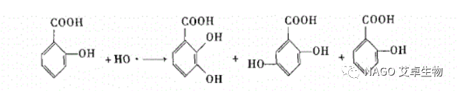 水楊酸與羥自由基(·OH)反應生成可 2,3- 二羥基苯甲酸,它在 510 nm處有最大吸收波長。利用過氧化氫(H2O2)與七水硫酸亞鐵(FeSO4·7H2O反應生成·OH,加入具有清除自由基能力的物質,可抑制2,3-二羥基苯甲酸生成,降低 510 nm 處的吸光度。