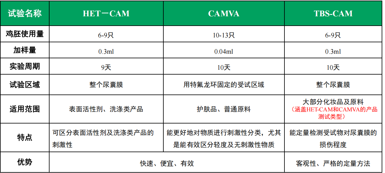 作為一種動物實驗替代方法,雞胚模型能夠客觀評估產品刺激性,為產品研發提供更為精準的指導。雞胚模型檢測體系,包含雞胚絨毛尿囊膜試驗(HET-CAM)、雞胚絨毛尿囊膜血管試驗(CAMVA)以及雞胚尿囊膜臺盼藍染色試驗(TBS-CAM)三類方法。